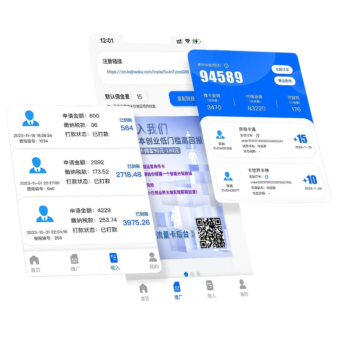 代理規模約 22 萬,卡品以聯通、電信為主,傭金處于行業中等水平,返傭時效為 T+3。其核心短板在于客服響應慢(平均 1.5 小時)、推廣支持薄弱,僅適合有成熟渠道的資深代理,新手適配度較低。